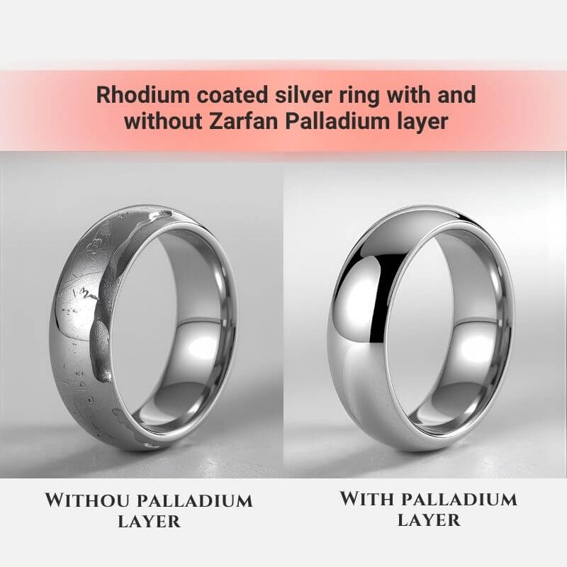 Zarfan’s Palladium Electroplating Solution is a high-purity, mildly alkaline electrolyte developed to create a bright, white, and corrosion-resistant layer that serves as a perfect intermediate or underlayer in multi-step plating processes. The coating forms a smooth, crack-free surface that significantly enhances the adhesion of gold, rhodium, and ruthenium layers while preventing tarnish, diffusion, or color migration. In professional electroplating workflows, palladium plays three essential roles: 1. It serves as an underlayer for rhodium plating on silver or gold, ensuring better adhesion and brightness. 2. It functions as a base layer for black ruthenium plating on silver, providing color stability and improved durability. 3. It acts as an intermediate diffusion barrier between nickel and gold or rhodium, preventing discoloration and ensuring long-term surface stability.