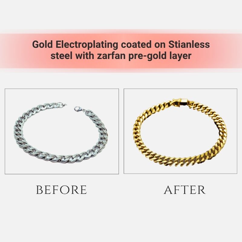 Zarfan’s Pre-Gold Solution is designed for workshops that require strong adhesion, process stability, and guaranteed final quality in the initial stages of electroplating. By activating the metal surface, it improves the bonding between the base metal and the final gold layer, ensuring a uniform, bright, and durable result. In jewelry and gold manufacturing, using Zarfan’s Pre-Gold ensures that the subsequent gold layer deposits evenly, brilliantly, and firmly .Its specialized formula prevents base metal oxidation, reduces waste, and improves plating quality in subsequent steps.